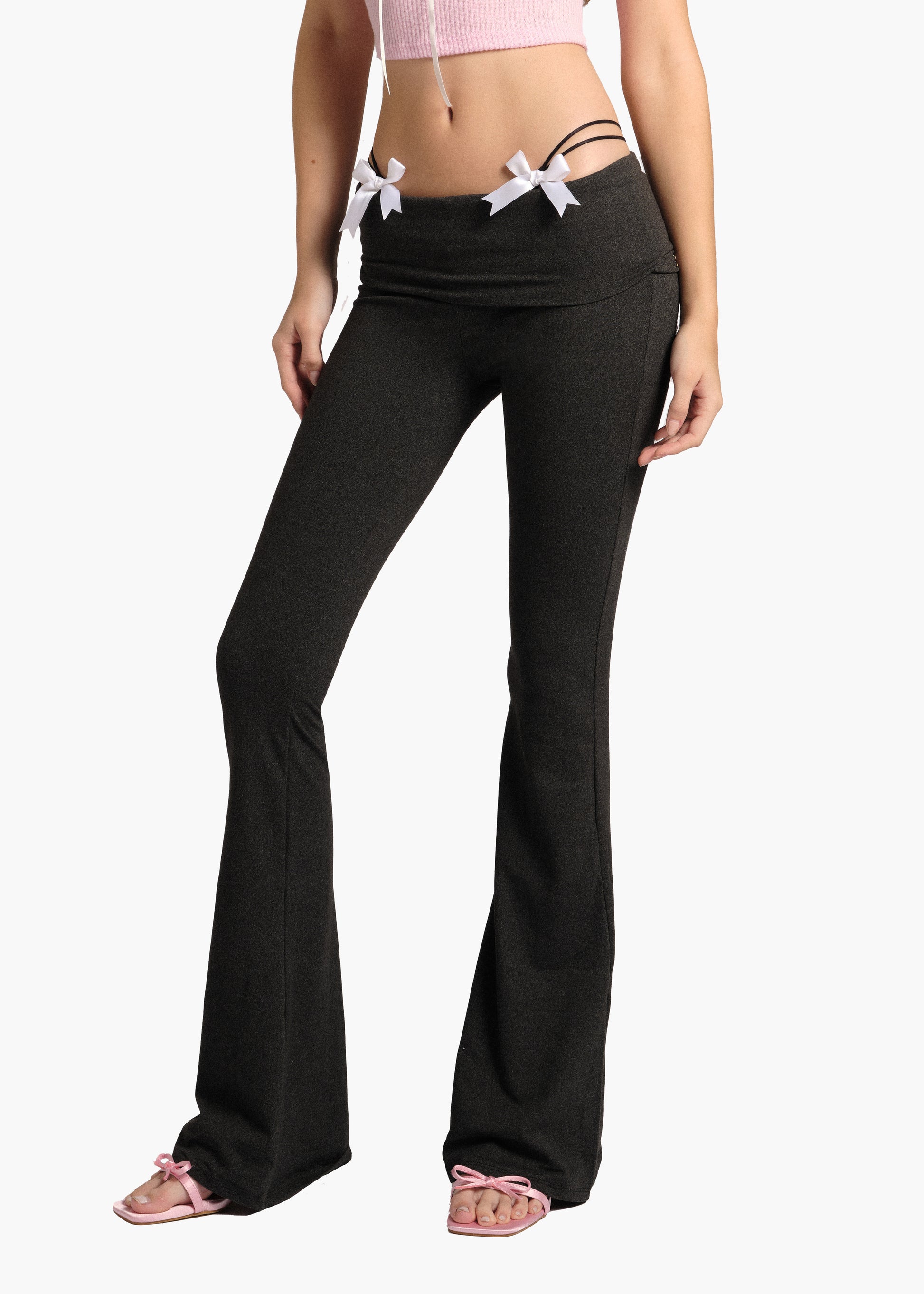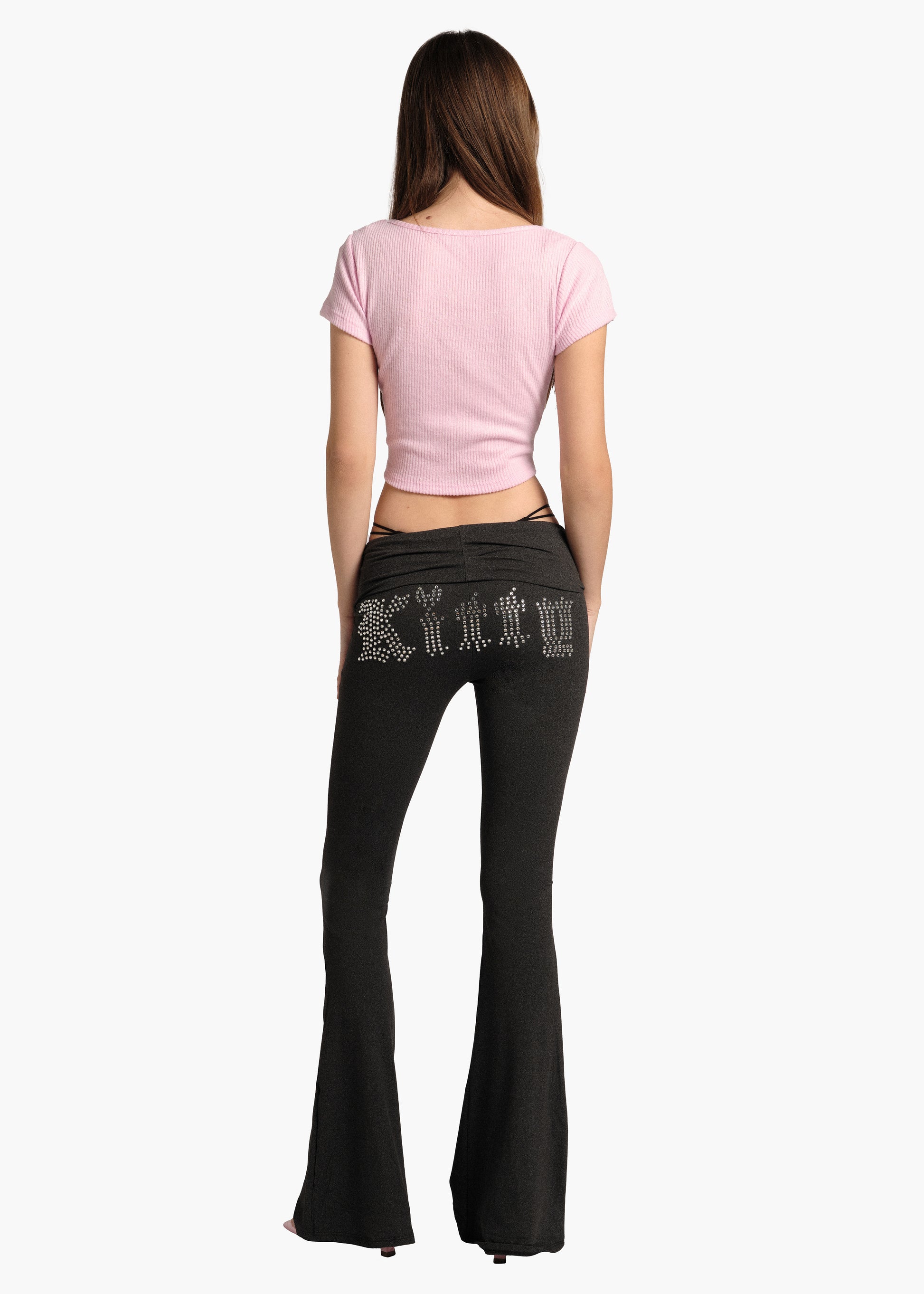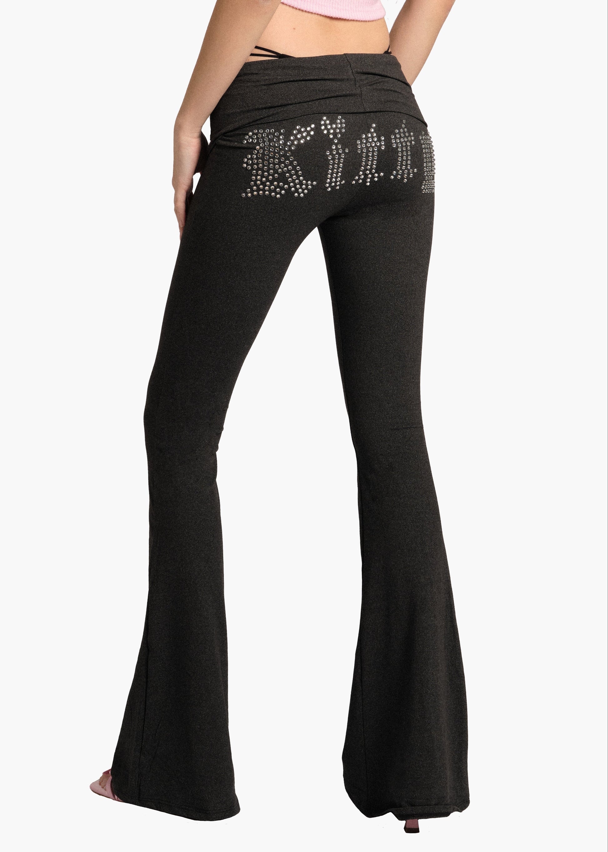 Low-rise flares that melt to your shape with a soft, effortless stretch. The foldover waist and bootcut leg create that perfect hourglass line, finished with rhinestone 'Kitty' that catches every light. Made for Angels with claws.