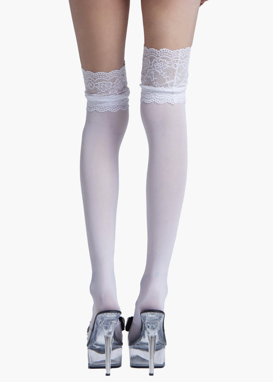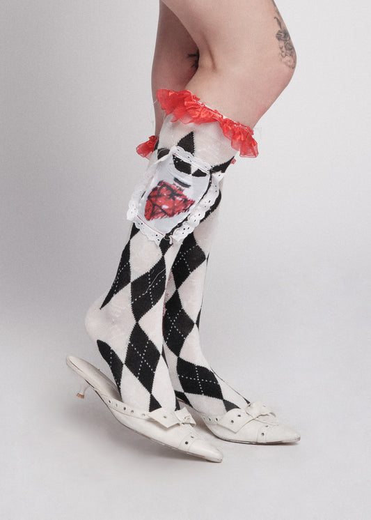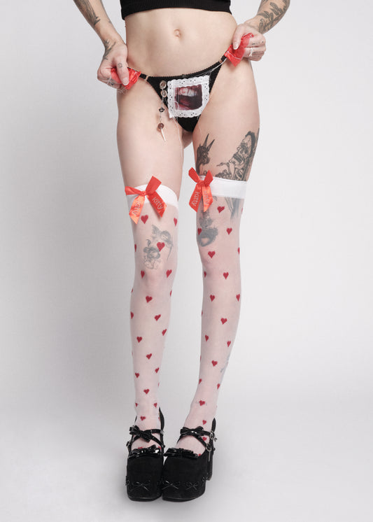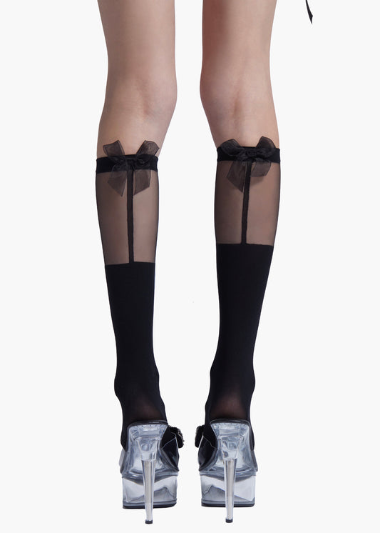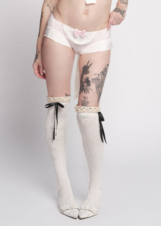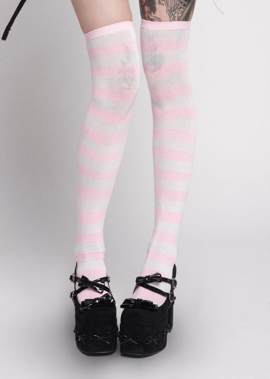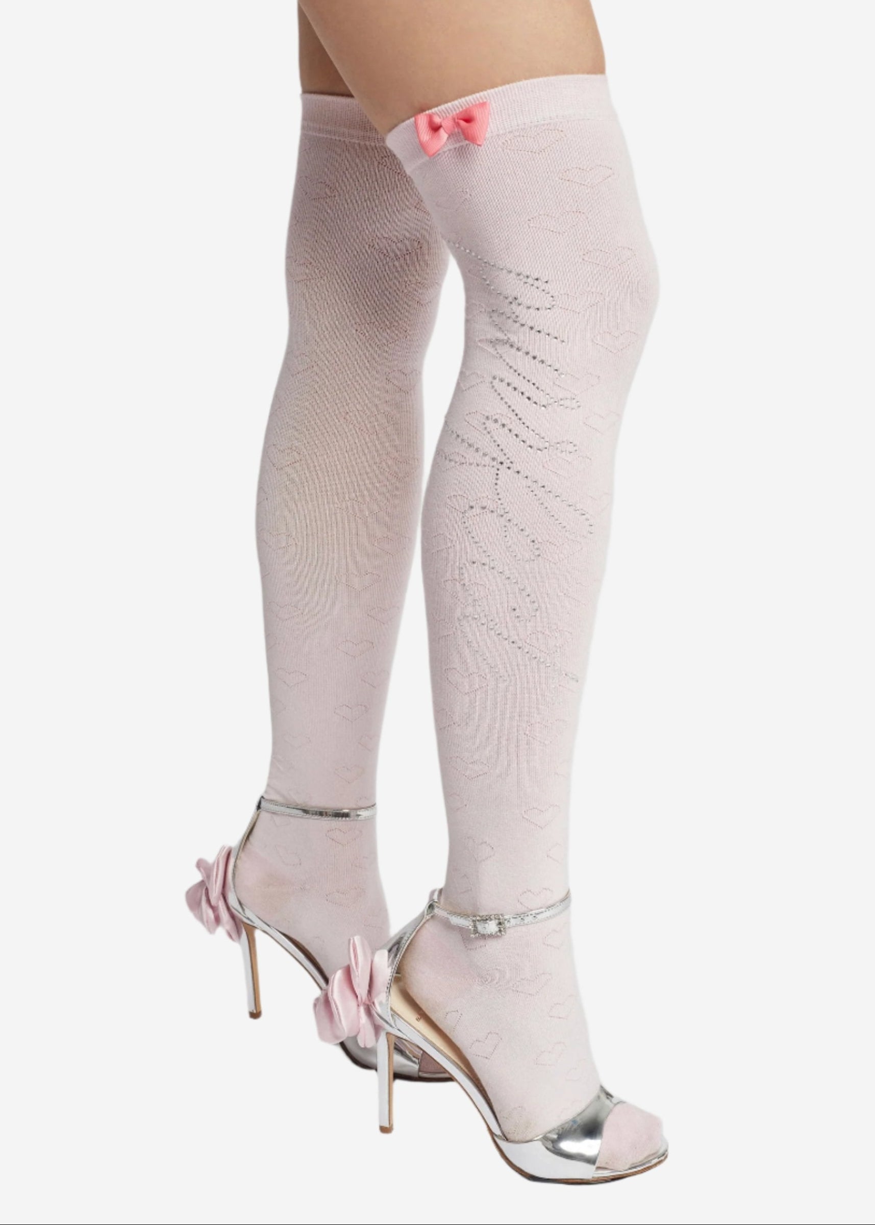 Light pink knee high socks with 'Purrfect' rhinestone embellishments.