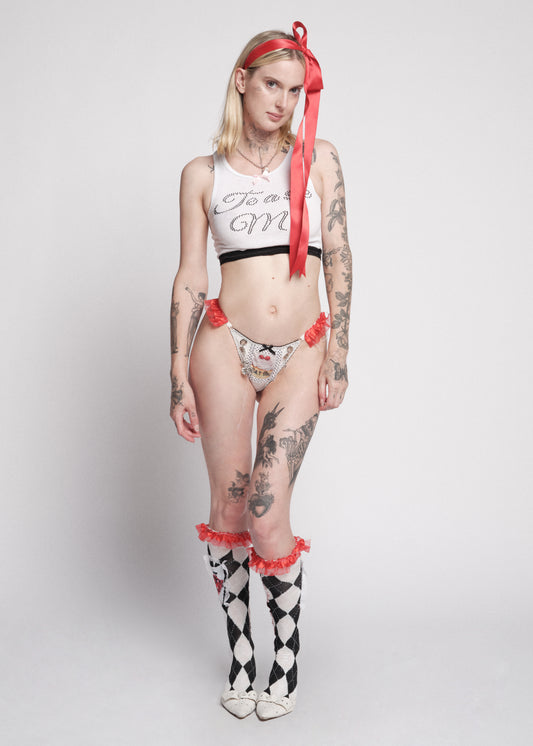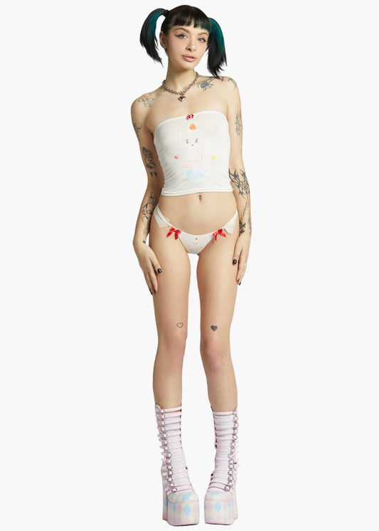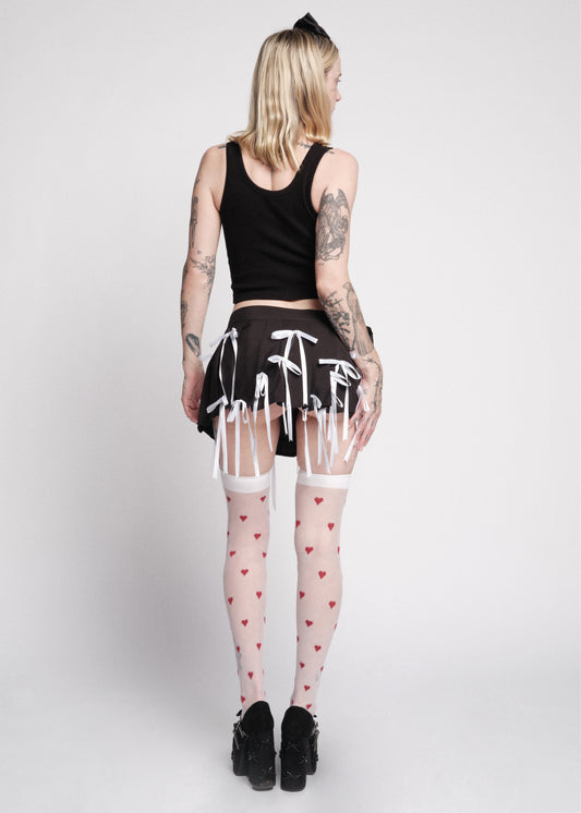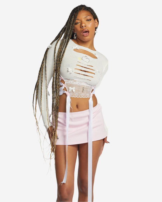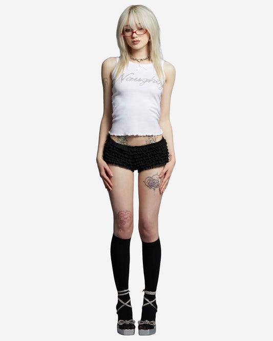 Sheer lace black long top with 'Meow' rhinestone and bow embellishments.